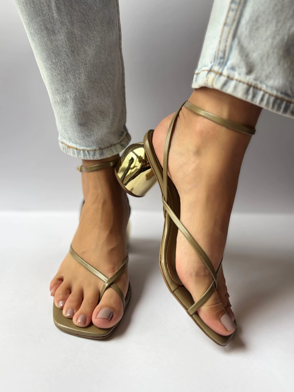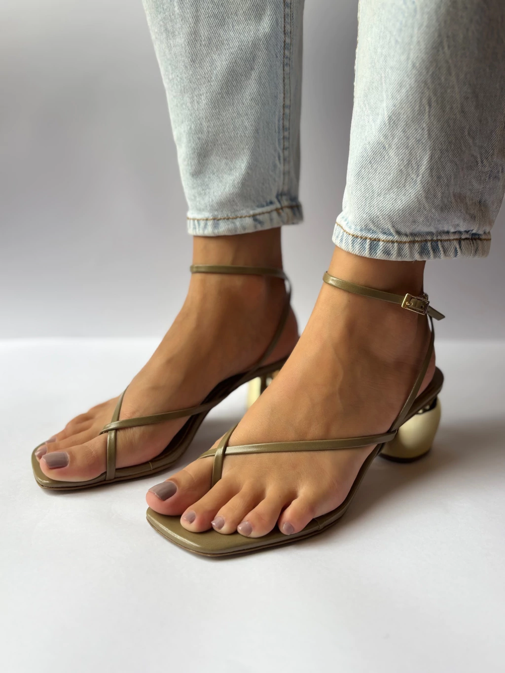 Sandália Olivia é para aquela mulher que busca um calçado com identidade. Moderna e com um design sofisticado, seu shape minimalista e com um tom versátil de verde oliva casa perfeitamente com o salto geométrico e espelhado.